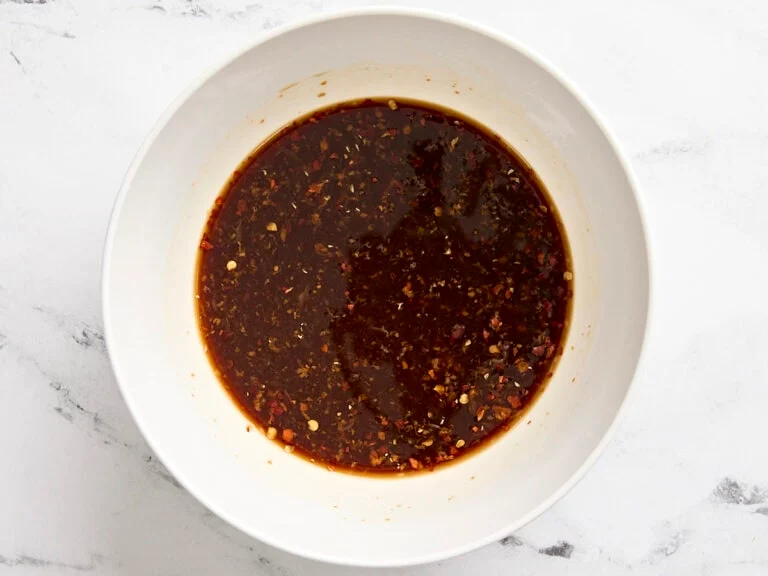 1. In a medium pot, add orange juice, sugar, vinegar, soy sauce, ginger, garlic, and red chili flakes. Heat for 3 minutes.