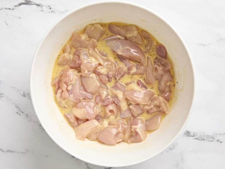 5. Dip chicken pieces in egg mixture and then flour mixture. Place on plate.